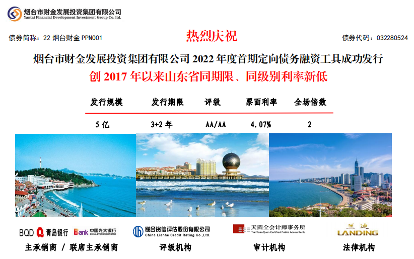 6月8日,煙臺(tái)財(cái)金集團(tuán)2022年度首期定向債務(wù)融資工具(PPN)在中國銀行間市場交易商協(xié)會(huì)成功發(fā)行!發(fā)行規(guī)模5億元,期限3+2年,票面利率4.07%,全場認(rèn)購倍數(shù)2倍,創(chuàng)2017年以來山東省同期限、同級(jí)別利率新低。本期債券發(fā)行由青島銀行牽頭主承,光大銀行聯(lián)席主承,聯(lián)合資信、天圓全會(huì)計(jì)師事務(wù)所及蘭迪律師事務(wù)所分別提供信用評(píng)級(jí)、審計(jì)和法律服務(wù)。