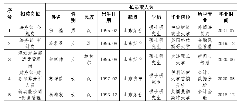 按照2020年8月28日發(fā)布的《2020年煙臺財金集團面向“雙一流”和全球TOP200高校畢業(yè)生公開招聘簡章》相關規(guī)定,經(jīng)過簡歷收集、資格審查、初試、復試、集體決策等環(huán)節(jié),擬確定部分崗位錄取人選(詳見下表),現(xiàn)予以公示,公示期為5個工作日(9月29日至10月13日)。公示期間如有異議,請與煙臺市財金發(fā)展投資集團有限公司聯(lián)系,電話:0535-6887256。